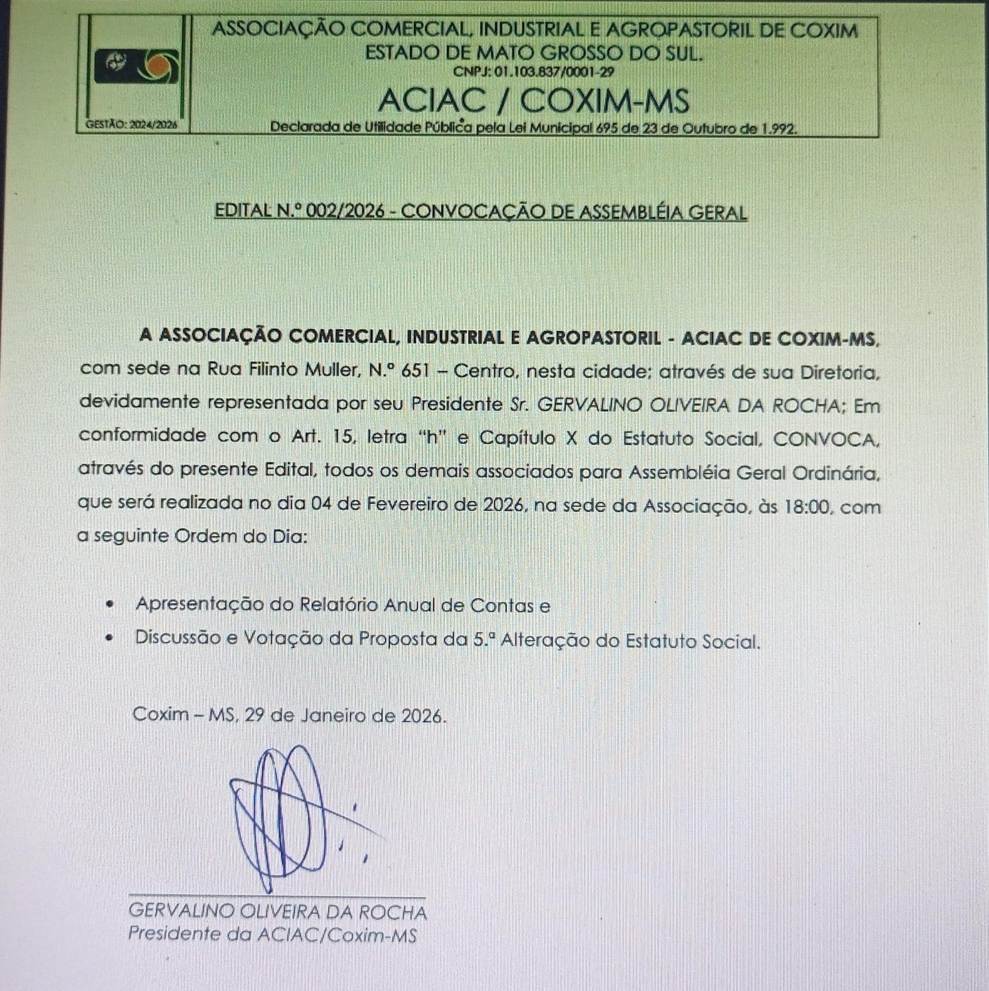 A Associação Comercial, Industrial e Agropastoril - ACIAC de Coxim-MS, com sede na Rua Filinto Muller, nº 651 – Centro, nesta cidade, através de sua Diretoria, devidamente representada por seu Presidente, senhor Gervalino Oliveira da Rocha, em conformidade com o Art. 15, letra “h” e Capítulo X do Estatuto Social, CONVOCA, através do presente Edital, todos os demais associados para Assembléia Geral Ordinária, que será realizada no dia 04 de Fevereiro de 2026, na sede da Associação, às 18h, com a seguinte Ordem do Dia: