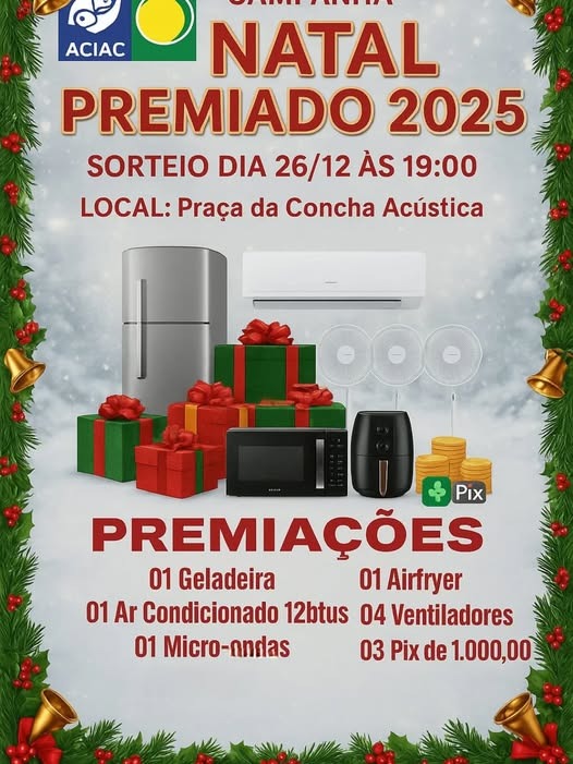 No fortalecimento das ações promocionais, a ACIAC realizou com sucesso a Campanha Natal Premiado em 2024 e 2025, com o sorteio de prêmios expressivos, movimentando o comércio local e incentivando as compras no município.