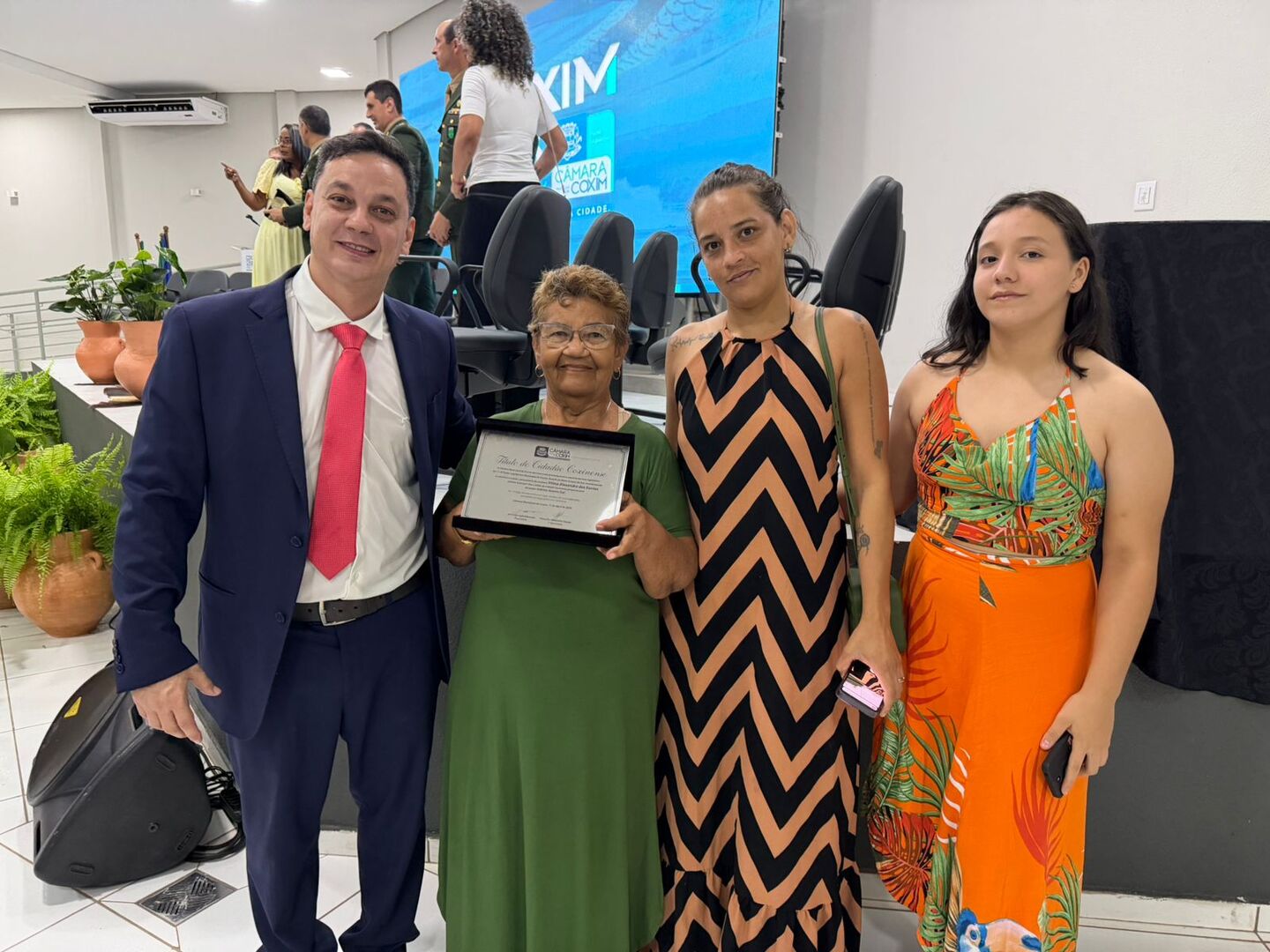 Na ocasião, o vereador Johnny Guerra Gai (PP) concedeu o Título de Cidadã Coxinense à senhora Vilma Alexandre dos Santos. Natural de Rio Verde de Mato Grosso (MS), ela tem 64 anos e mudou-se ainda jovem para Coxim, onde reside há cerca de cinco décadas, construindo uma trajetória de vida pautada pelo trabalho e dedicação à comunidade.