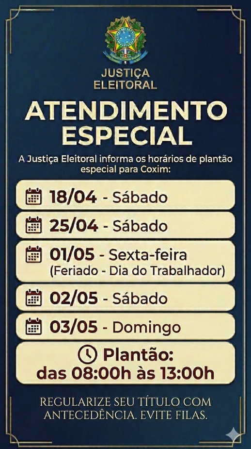 De acordo com o cronograma divulgado, os atendimentos em regime especial acontecerão nos dias 18 e 25 de abril, ambos aos sábados, além do dia 1º de maio, feriado nacional do Dia do Trabalhador. A programação segue ainda com plantões nos dias 2 de maio (sábado) e 3 de maio (domingo), ampliando significativamente as oportunidades para que os eleitores procurem atendimento fora do horário convencional.