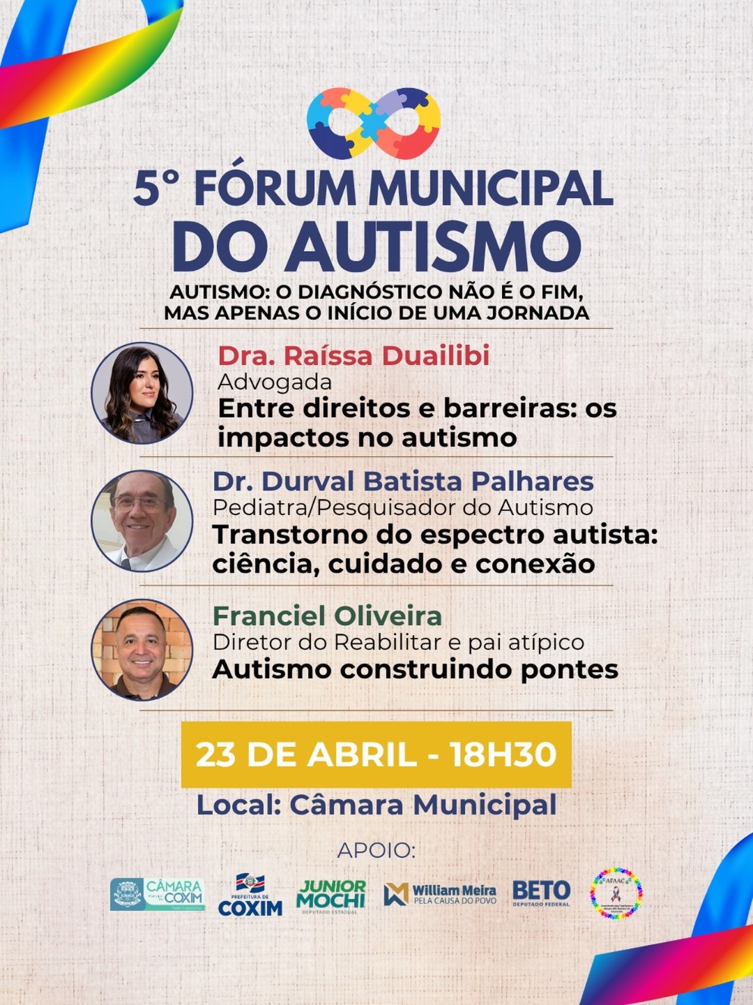 Coxim será palco de um dos encontros mais relevantes do calendário social e educacional do município: o 5º Fórum Municipal do Autismo, marcado para o dia 23 de abril, às 18h30, na Câmara Municipal da cidade.