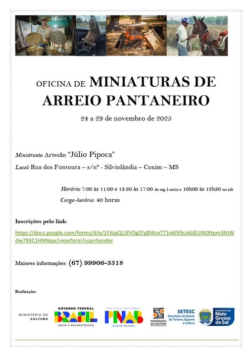A Política Nacional Aldir Blanc tem o prazer de anunciar a Oficina de Arreios Pantaneiros em Miniatura - gratuita - uma iniciativa que acontecerá entre os dias 24 e 29 de novembro de 2025. As aulas ocorrerão no ateliê do renomado artesão Júlio Pipoca, localizado na Rua dos Fontoura, s/nº - Silviolândia, em Coxim, de segunda a sexta-feira nos períodos matutino (7h00 às 11h00) e vespertino (13h30 às 17h00) e no sábado (10h00 às 12h30).