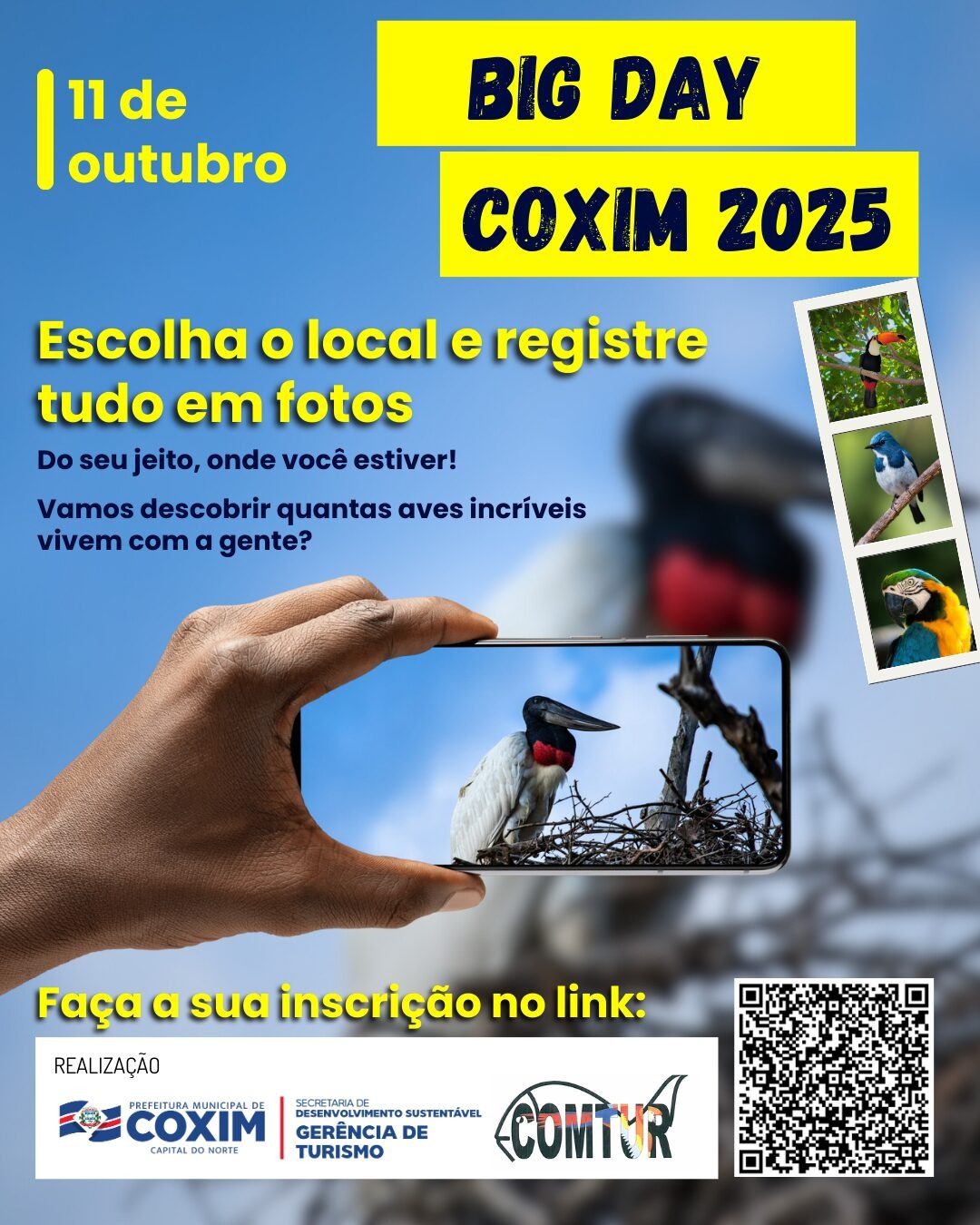 Os participantes podem se inscrever pelo link Big Day Coxim 2025 e registrar suas imagens do jeito que preferirem, de onde estiverem, contribuindo para o conhecimento e divulgação da fauna local. A iniciativa busca engajar a comunidade na observação e preservação das aves, promovendo o turismo sustentável em Coxim, conhecida como a Capital do Norte.