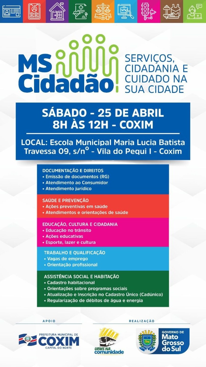 A Prefeitura Municipal de Coxim e o Governo do Estado de Mato Grosso do Sul realizam, neste sábado (25 de abril), o mutirão de serviços MS Cidadão. A ação acontece das 8h às 12h, na Escola Municipal Maria Lucia Batista, localizada na Vila do Pequi I. O objetivo da iniciativa é facilitar o acesso da população a serviços essenciais de cidadania, saúde, educação e assistência social em um único local.