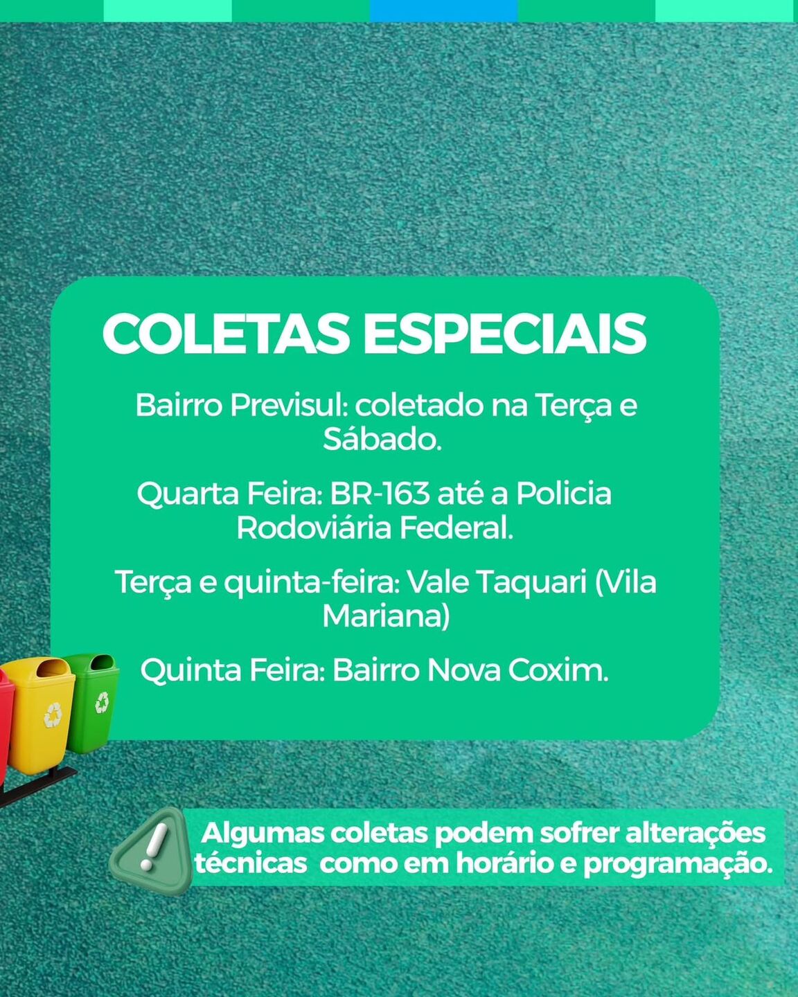 O cronograma também prevê coletas especiais, com atendimento ao bairro Previsul na terça e sexta-feira, em período noturno. Nessas mesmas noites, há coleta na BR-163 até a Polícia Rodoviária Federal, na quinta-feira na região do Vale Taquari (Vila Zumbi dos Palmares) e, na quinta à noite, no bairro Nova Coxim.