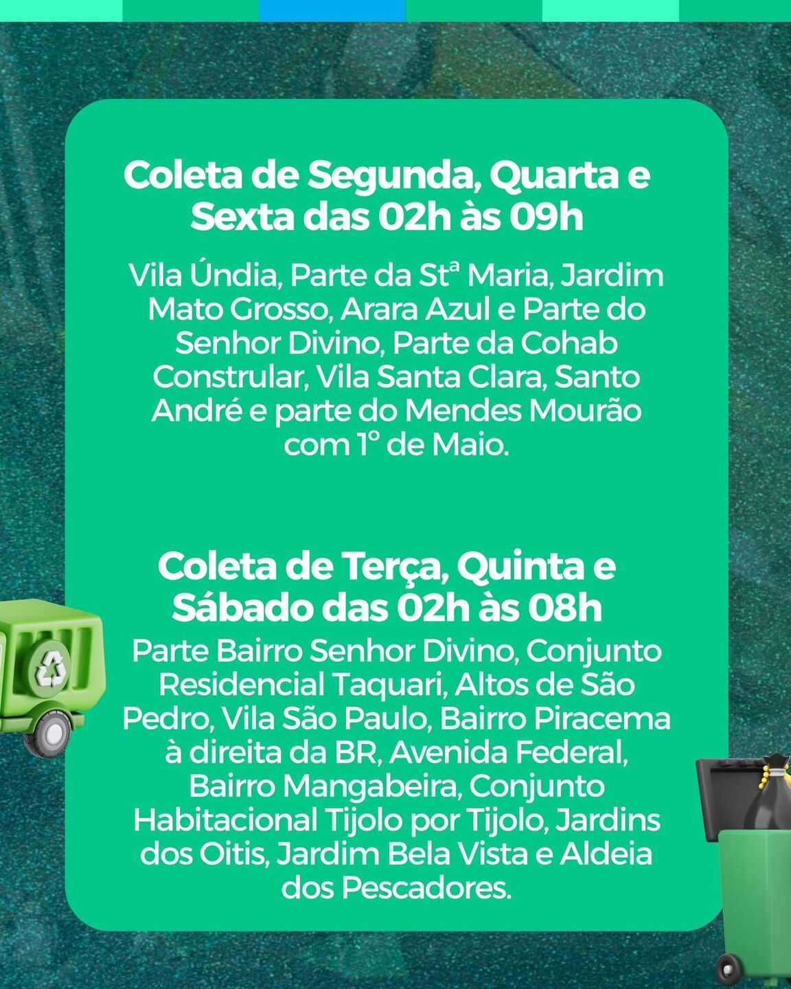 De segunda, quarta e sexta-feira, das 02h às 09h, a coleta atende a Vila Úndia, parte do Santa Maria, Jardim Mato Grosso, Arara Azul e parte do Senhor Divino, além da parte da Cohab (Constrular), Vila Santa Clara, Santo André e parte do Conjunto Elias Muraoka, com 1º de Maio.