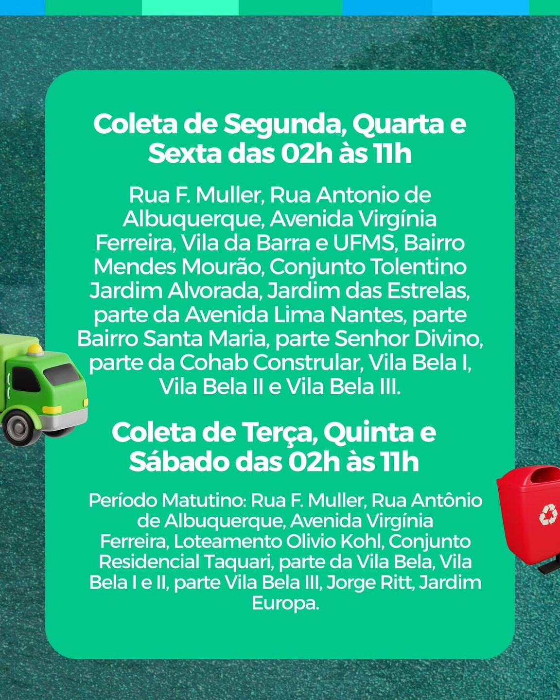 No mesmo bloco, a coleta de terça, quinta e sábado, das 02h às 11h, contempla o período matutino na Rua Filinto Muller, Rua Antônio de Albuquerque, Avenida Virginia Ferreira, Loteamento Olívio Kohl, Conjunto Residencial Taquari, parte da Vila Bela, Vila Bela I e II, parte da Vila Bela III, Jorge Ritt e Jardim Europa.