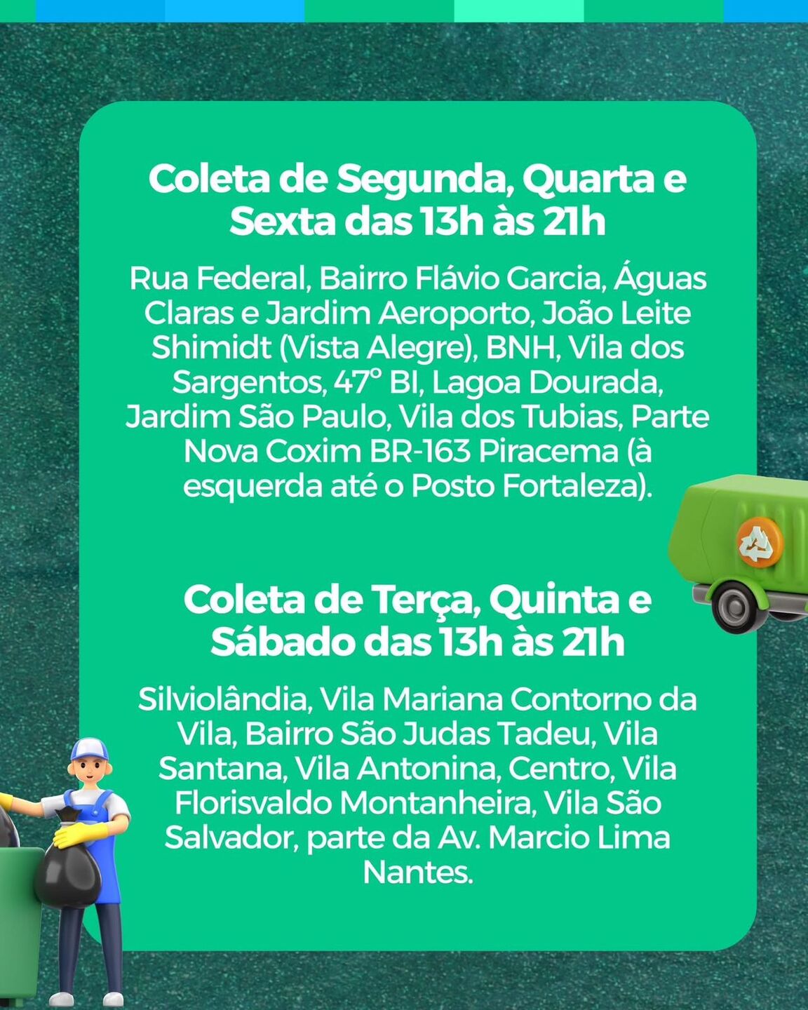 Já a coleta de terça, quinta e sábado, das 13h às 21h, atende Silviolândia, Vila Mariana (contorno da Vila), bairro São Judas Tadeu, Vila Santana, Vila Antoninha, Centro, Vila Florisvaldo Montanher, Vila São Salvador e parte da Avenida Marcio Lima Nantes.