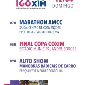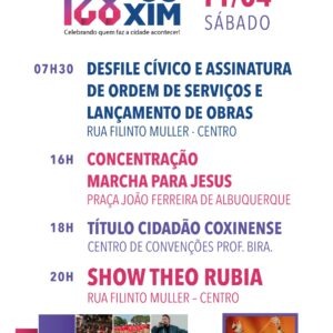 Sábado (11/04): O dia principal de celebrações inicia às 07h30 com o tradicional Desfile Cívico na rua Filinto Muller no centro de Coxim. No mesmo local, haverá a assinatura de ordens de serviço e o lançamento de novas obras para o município.