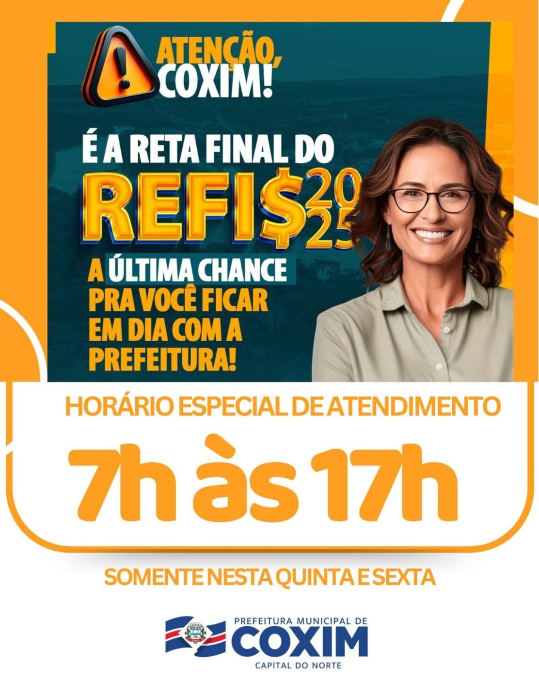A Prefeitura de Coxim informa que quinta e sexta-feira serão os últimos dias para adesão ao Programa de Recuperação Fiscal (Refis 2025). Para facilitar o atendimento, a Gerência de Tributos atenderá em horário especial, das 7h às 17h, sem interrupção.