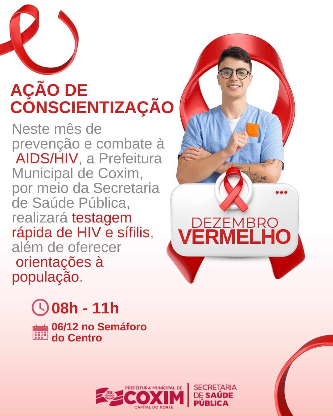 A Prefeitura Municipal de Coxim, por meio da Secretaria de Saúde Pública, promove neste sábado, 06 de dezembro, das 08h às 11h, uma importante ação de conscientização sobre AIDS e HIV, reforçando o movimento do Dezembro Vermelho e o compromisso do município com a prevenção e a saúde da população.
