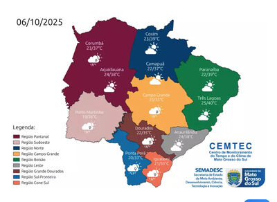 Contudo, estão previstas para esta segunda-feira as mínimas entre 20 e 22°C e máximas entre 33 e 35°C para a região sul, cone-sul e grande Dourados. Nas regiões pantaneira e sudoeste, as mínimas devem variar entre 19 e 24°C e máxima entre 36 e 38°C. Já nas regiões do bolsão, leste e norte os termômetros devem registrar mínimas entre 22 e 25°C e máximas entre 37 e 40°C.