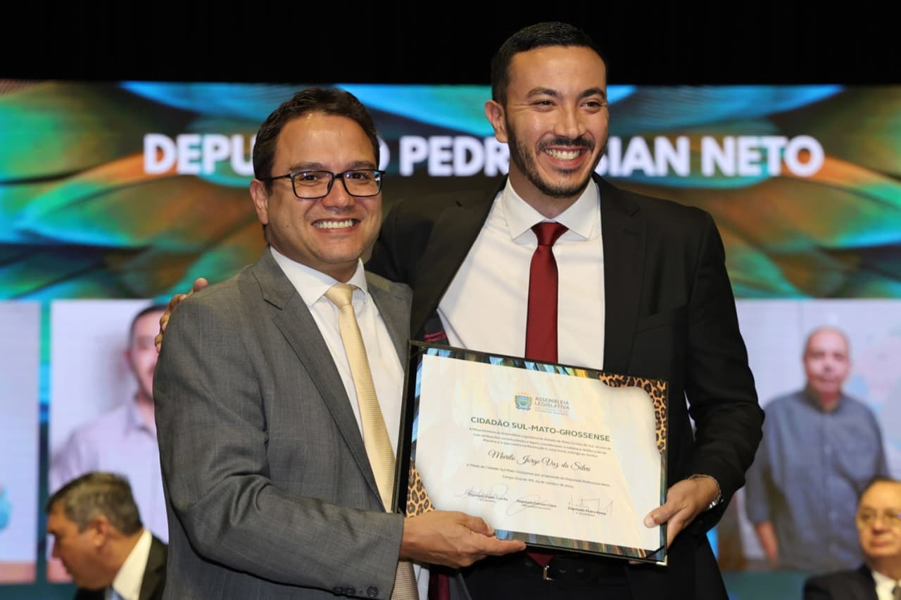 Em uma noite marcada por emoção, reconhecimento e celebração, o prefeito de Pedro Gomes, Delegado Murilo, recebeu nesta quarta-feira (29) o Título de Cidadão Sul-Mato-Grossense, concedido pela Assembleia Legislativa de Mato Grosso do Sul (ALEMS). A honraria foi entregue pelas mãos do deputado Pedro Pedrossian Neto durante cerimônia no auditório Manoel de Barros, no Centro de Convenções Rubens Gil de Camillo, em Campo Grande.