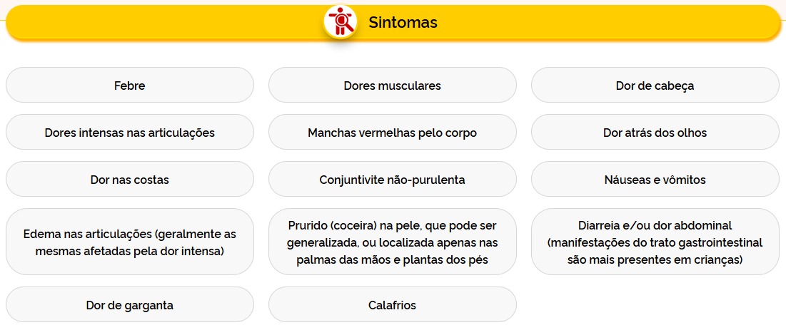 Os sintomas são semelhantes aos da dengue, mas costumam ser mais intensos e duradouros. Febre alta e dores articulares marcantes são características da doença, podendo persistir por mais de 15 dias. Em mais da metade dos casos, as dores nas articulações podem se tornar crônicas e durar anos.